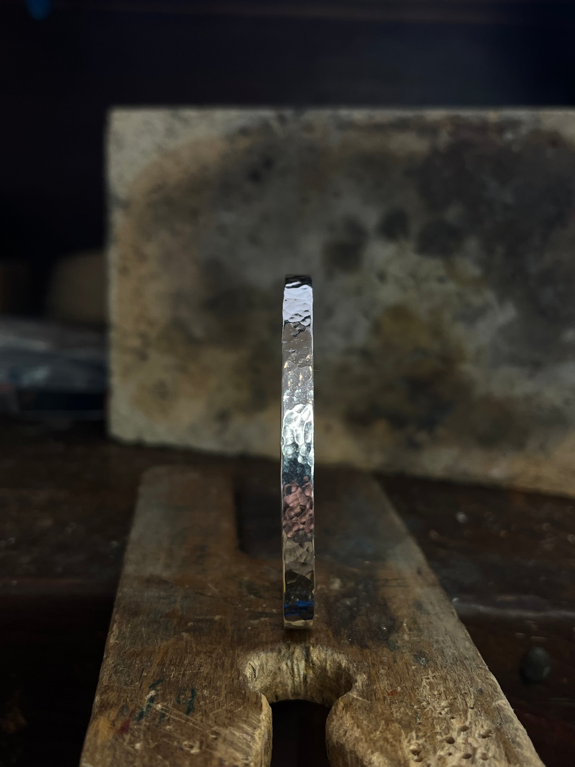 Realizzato interamente a mano, questo bracciale nasce dal colpo deciso del martello e dalla pazienza della lavorazione artigianale. La superficie martellata, unica e irregolare, conserva il segno del gesto e della maestria di chi lo ha forgiato, dando vita a un gioiello dal carattere vivo e autentico.