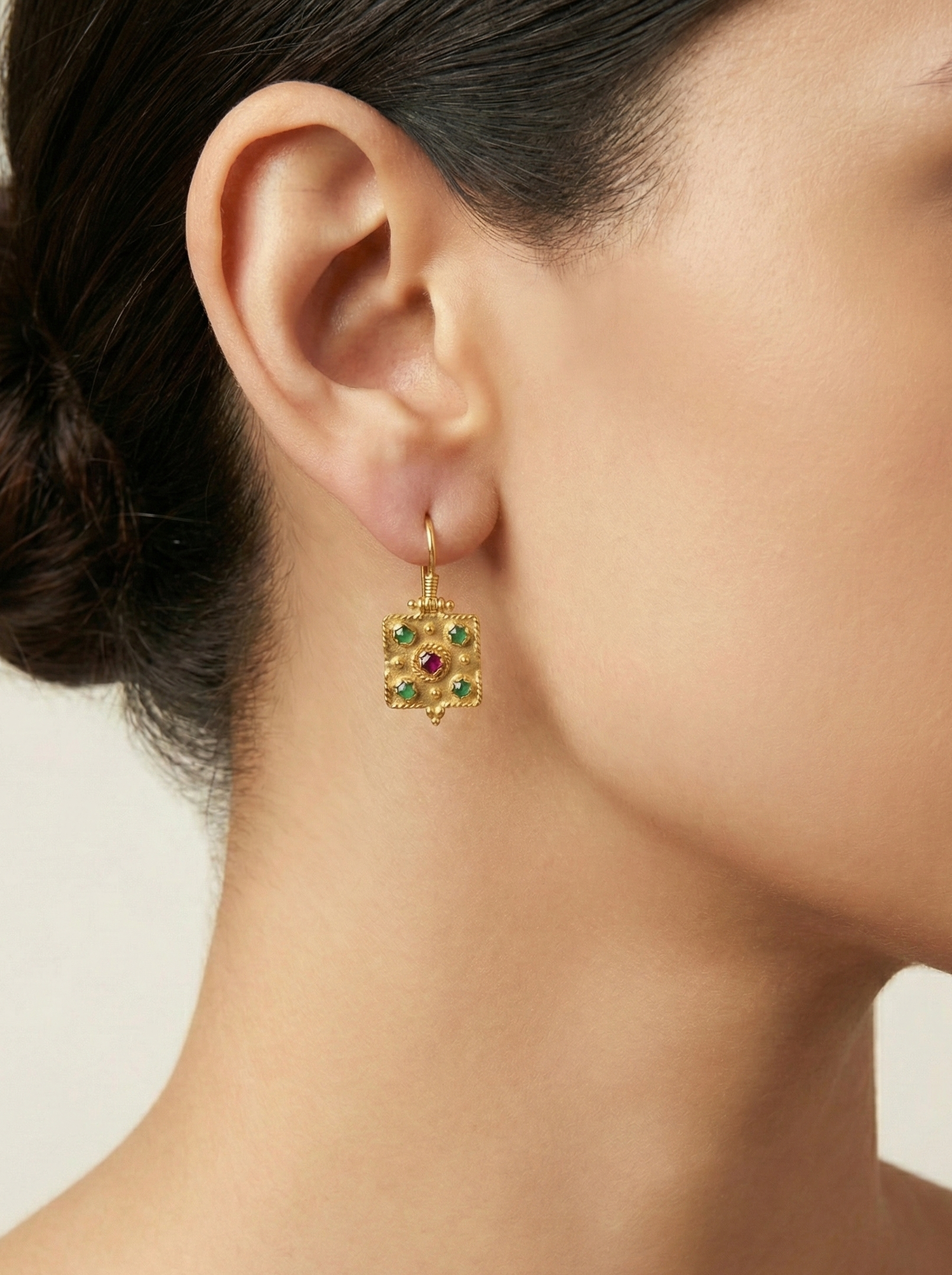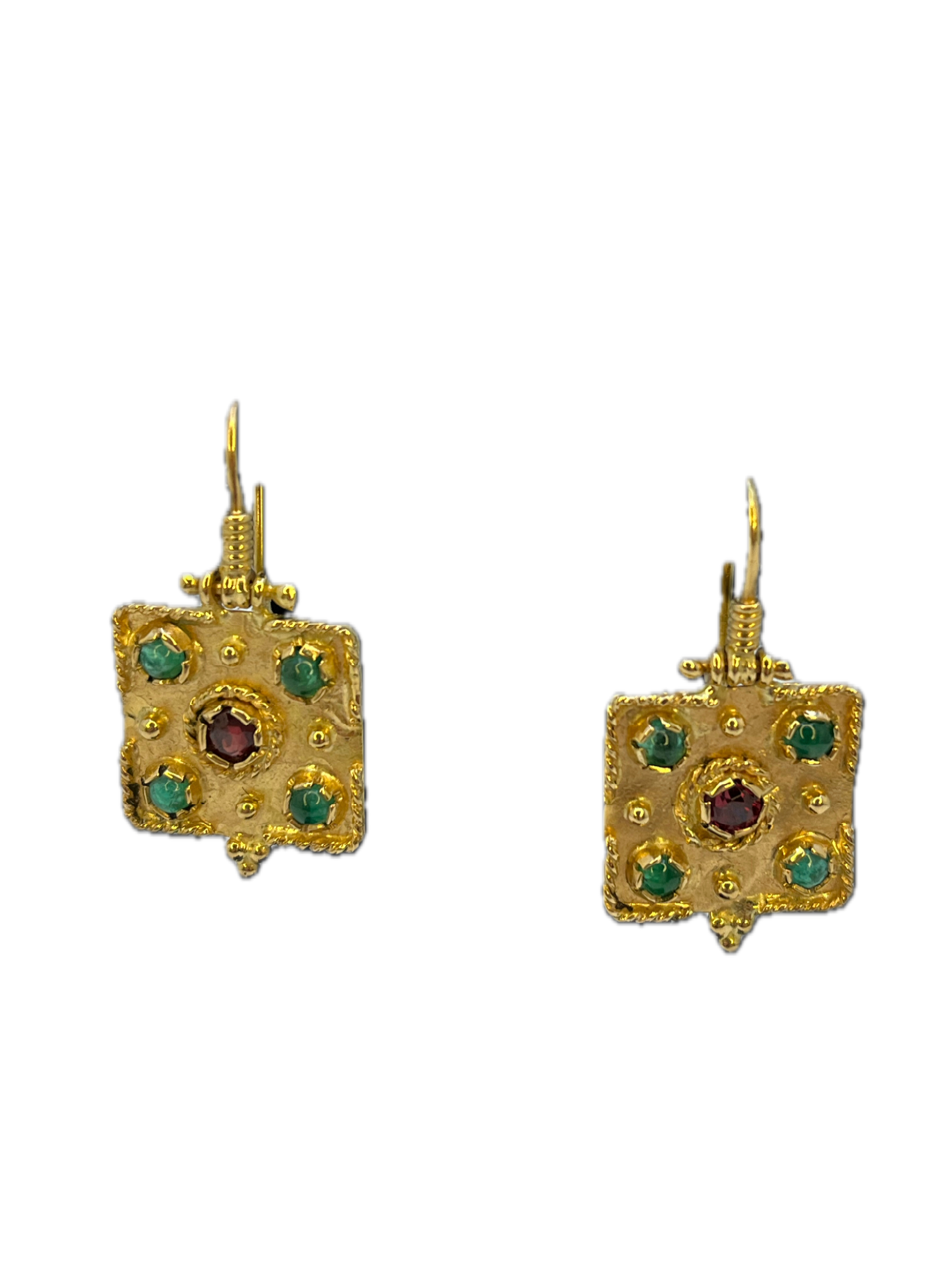 Questi sofisticati orecchini a monachella, realizzati in oro giallo 18kt , rappresentano l'apice della gioielleria artistica. La struttura quadrata è un trionfo della granulazione etrusca , decorata con microsfere d'oro e bordature a treccia che creano una cornice ricca di storia e fascino.